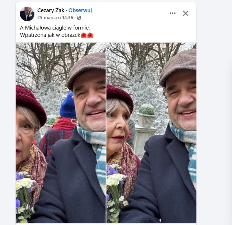 „A Michałowa ciągle w formie. Wpatrzona jak w obrazek” – napisał Żak, dodając żartobliwy podpis do dwóch kadrów, na których oboje aktorzy uśmiechają się do aparatu. Lipińska trzyma w dłoni bukiet kwiatów i spogląda na serialowego Proboszcza z czułością i rozbawieniem, podczas gdy w tle widać zimowy ogród i dekoracje sugerujące, że zdjęcie mogło zostać wykonane na planie filmowym.